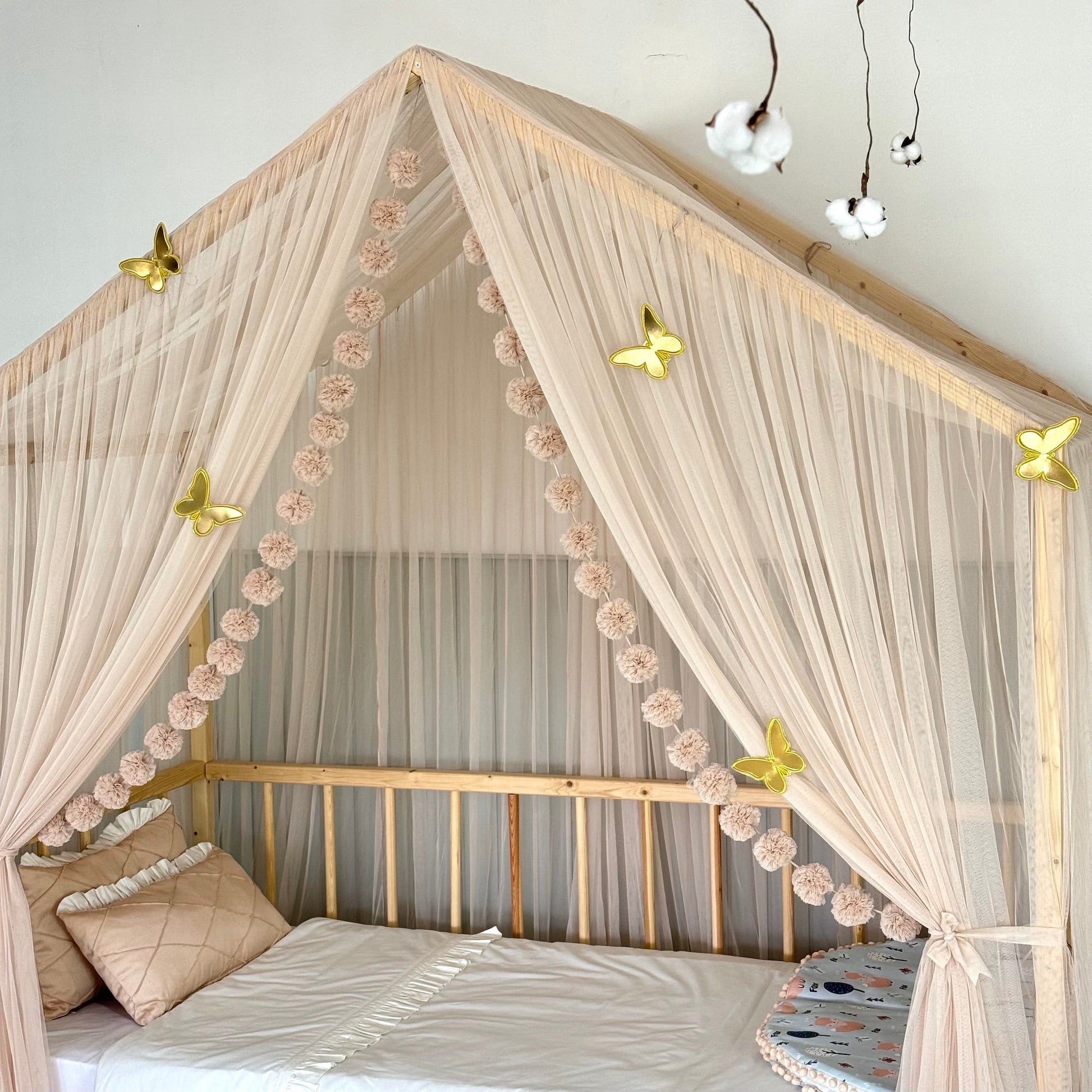 Çocuğunuzun odasını hem estetik açıdan göz alıcı hem de güvenli bir alana dönüştürün! Montessori yataklara özel olarak tasarlanan cibinliklerimiz, verdiğiniz ölçülere göre tamamen kişiye özel olarak üretilmektedir. %100 el işçiliğiyle hazırlanan bu cibinlikler, huzurlu bir uyku ortamı sağlarken odaya masalsı bir dokunuş katıyor.