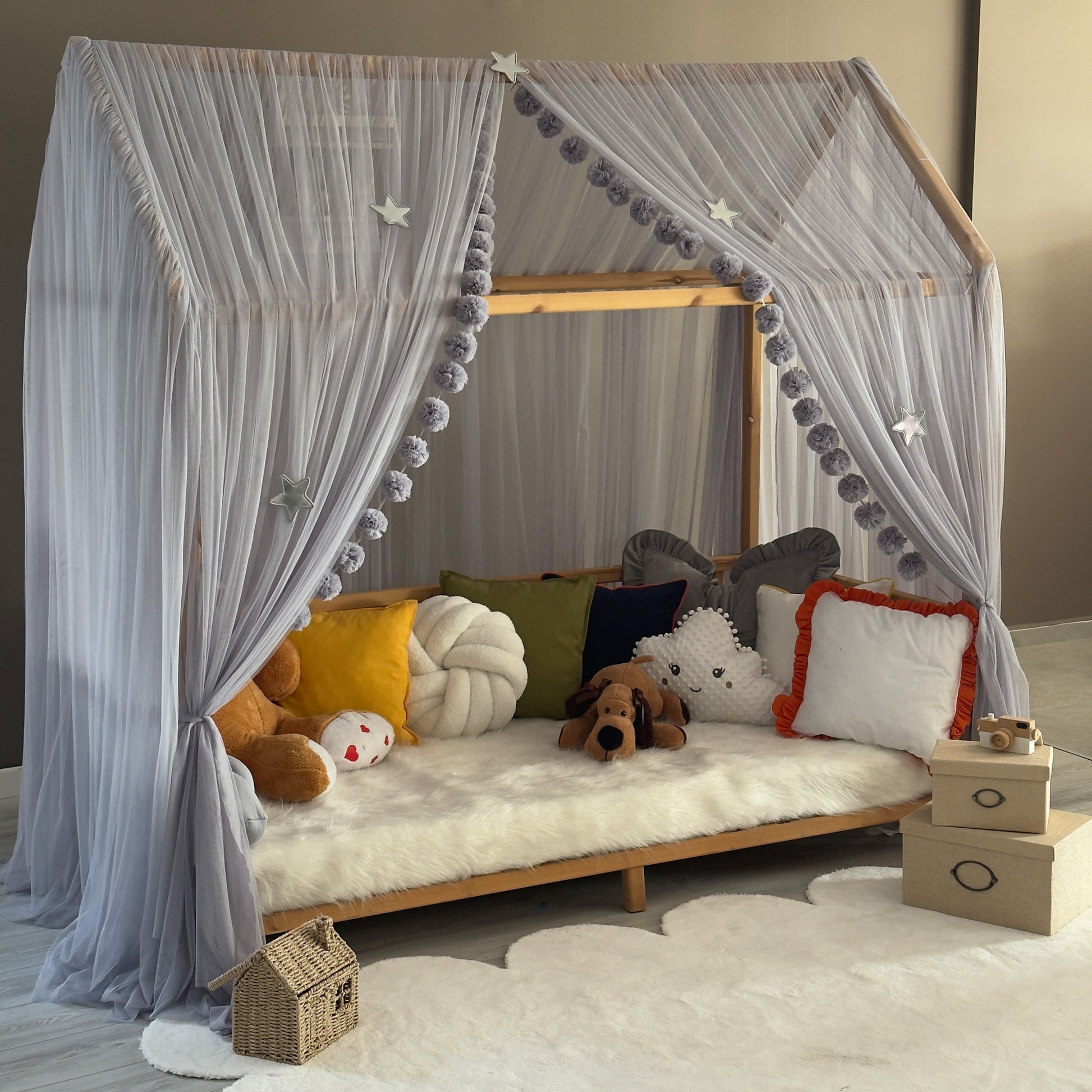 Çocuğunuzun odasını hem estetik açıdan göz alıcı hem de güvenli bir alana dönüştürün! Montessori yataklara özel olarak tasarlanan cibinliklerimiz, verdiğiniz ölçülere göre tamamen kişiye özel olarak üretilmektedir. %100 el işçiliğiyle hazırlanan bu cibinlikler, huzurlu bir uyku ortamı sağlarken odaya masalsı bir dokunuş katıyor.