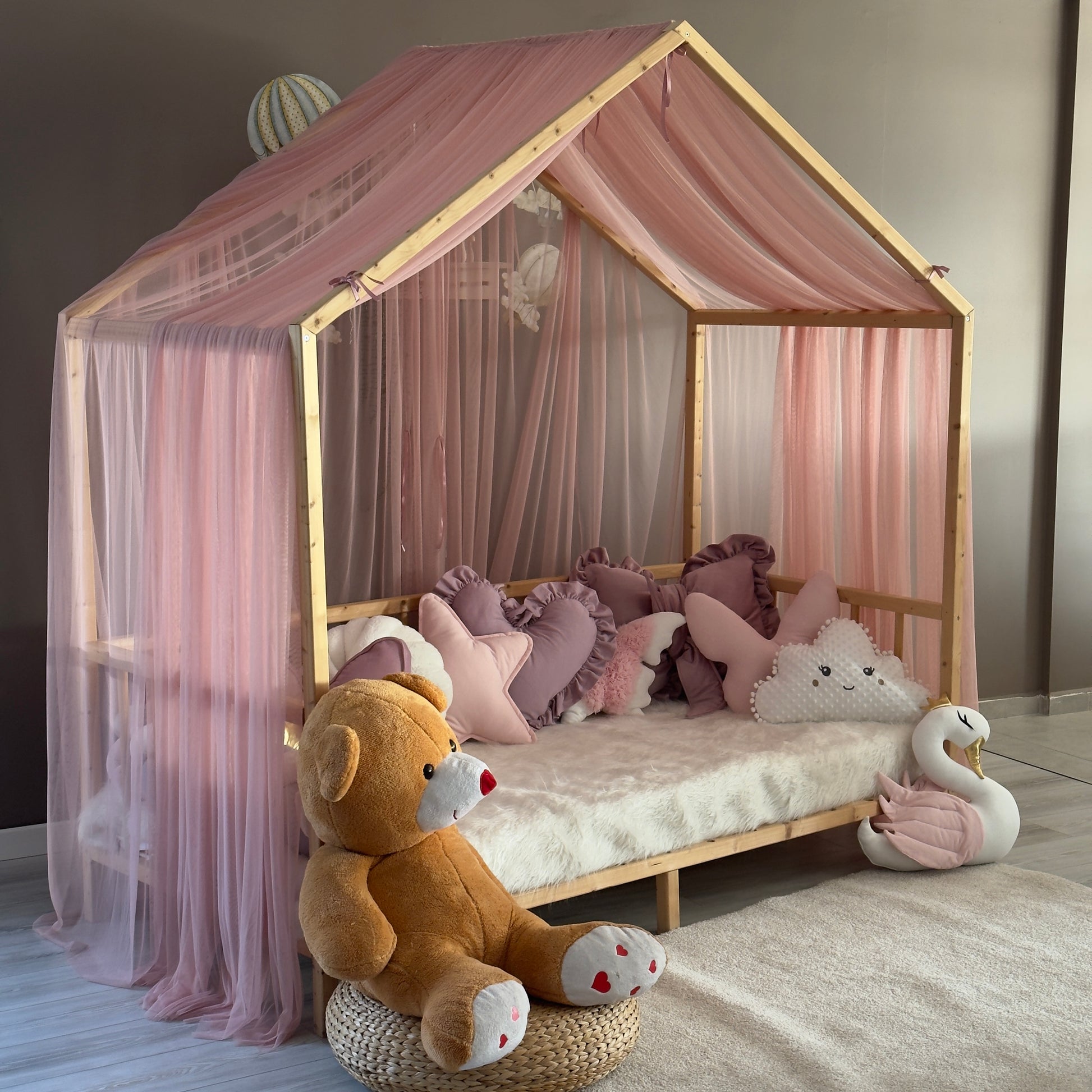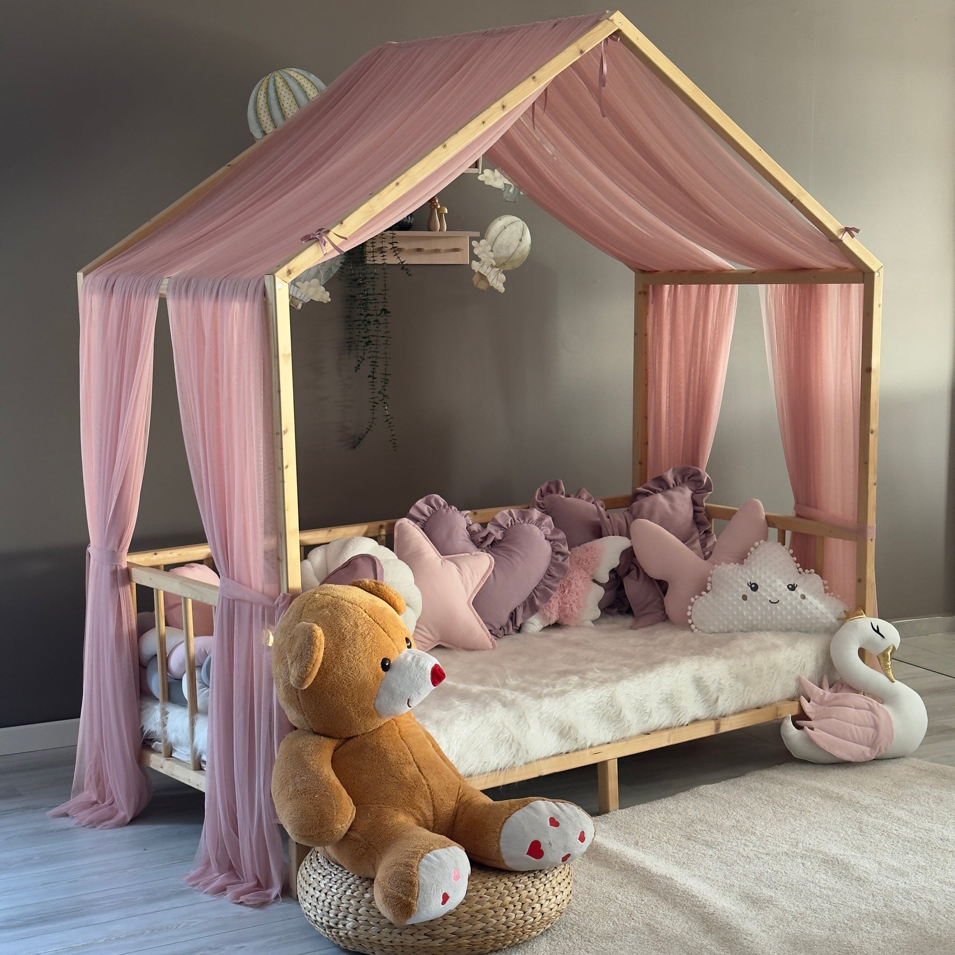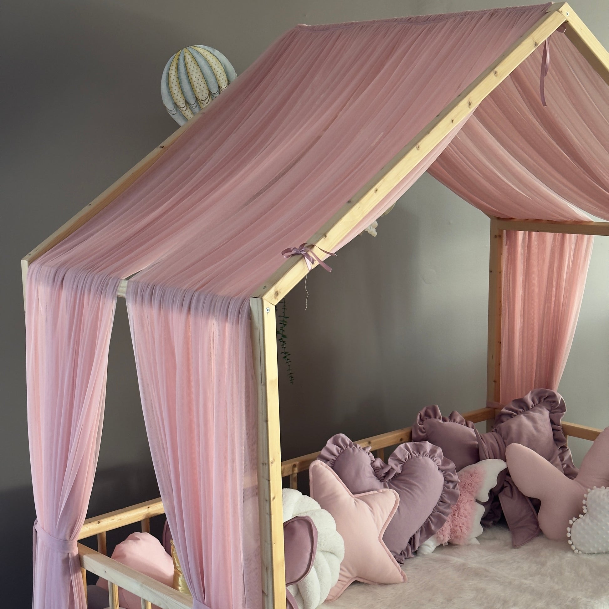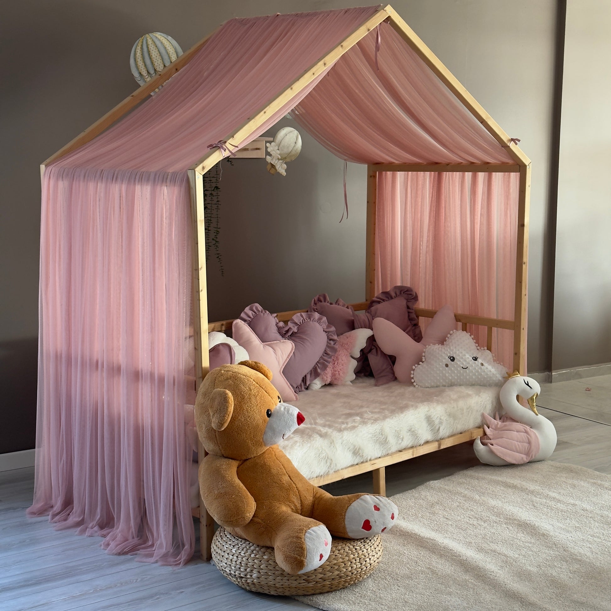 Çocuğunuzun odasını hem estetik açıdan göz alıcı hem de güvenli bir alana dönüştürün! Montessori yataklara özel olarak tasarlanan cibinliklerimiz, verdiğiniz ölçülere göre tamamen kişiye özel olarak üretilmektedir. %100 el işçiliğiyle hazırlanan bu cibinlikler, huzurlu bir uyku ortamı sağlarken odaya masalsı bir dokunuş katıyor.